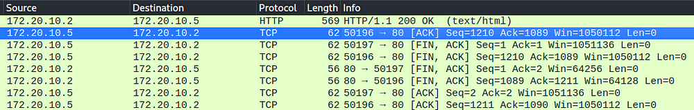 When filtering and analyzing the stream of TCP packets, we can see that a common pattern is followed — Attacker makes contact with victim (SYN) and receives an acknowledgment (ACK) from the scanned host, which follows the TCP SYN scanning method