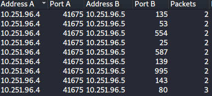 Sorting the entries by TCP, we can find that the scanned ports (port B) fall under the range of 1 -1024 (a common occurrence)