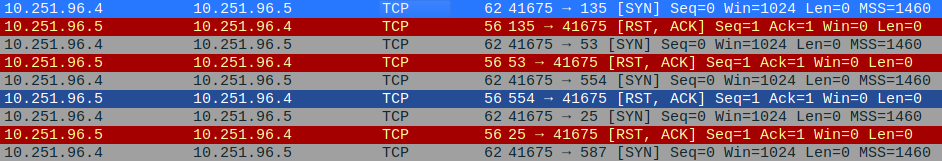 Sorting the packet stream by the TCP protocol, we can find that a host of machines (alive and responding) are being scanned by the host going under the address — 10.251.96.4