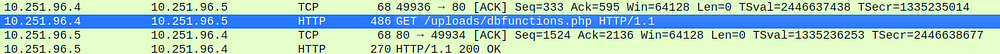 Filtering packets again by TCP, you can see the sequence where the attacker host accesses the Dbfunctions.php (the supposed web shell)