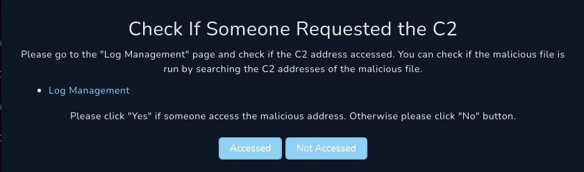 Q) Please go to the “Log Management” page and check if the C2 address accessed. You can check if the malicious file is run by searching the C2 addresses of the malicious file.