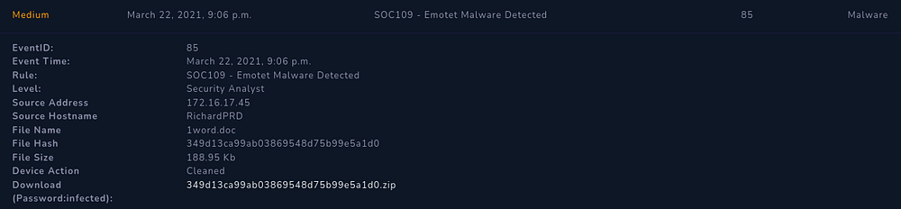 Hello, blue teamers and welcome to this blog entry, as I attempt to solve Let’s Defend ’s SOC109 — Emotet Malware alert. It was fun to work with real-world malware and trace back its origins and characteristics.