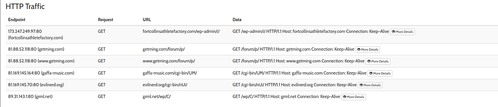 From Hybrid-Analysis, let’s note down outgoing traffic from this malicious file, to be added to our collection of artifacts