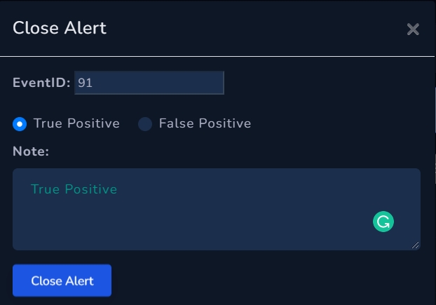 Close Alert — with notes, describing the alert as a True Positive